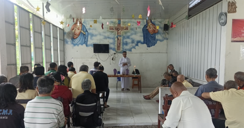 Pendamping juga turut hadir untuk memberikan dukungan dan memastikan seluruh warga dapat mengikuti ibadat dengan nyaman.